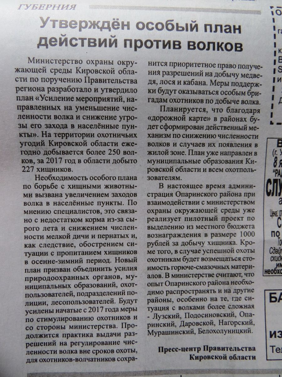 У вас там в Вятке что, начальник пресс-центра правительства чей-то родственник? Или он диплом "об верхнем образовании" купил, вместе со школьным аттестатом? Как его на работу взяли?! Ей-богу, читал и плакал! "Ежегодно добывается более 250 волков, за 2017 - 227 хищников." Ну, да 227 ведь больше 250! "Пилотный проект на территории Опаринского района" и тут же: "передовой опыт внедрить на территории других районов, в первую очередь...Опаринского района". Интересно, пресс-центр и редакция районки читают то, что публикуют, или это просто праздники еще не закончились?