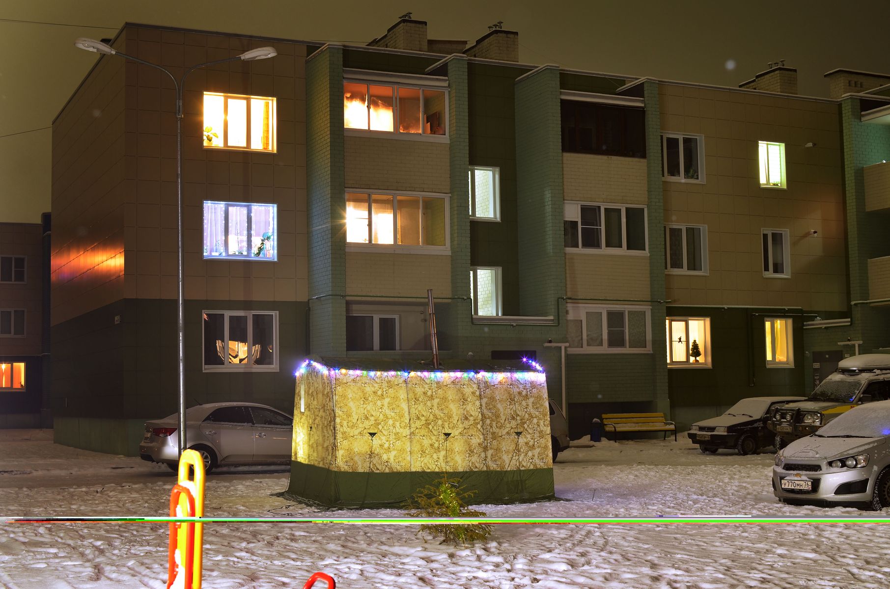 Тем временем подошел черед празднования в широких русских кругах СТАРОГО нового года. С субботы на воскресенье, да еще и снежок такой добрый пошел, настроение повышенное - благодать и лепота! В общем собрался с силами, мужеством и пошел во двор. двор у нас кольцом, внутри которого, в двух шагах от подъезда я и поставил палатку, на диво дивное всех соседей. Украсил гирляндой на батарейках - настроение же праздничное! Все удивлялись конечно, но отношение ни разу не агрессивное, что для меня стало приятным сюрпризом. Попарился от души сам, напарил детей, некоторые соседи посетовали, что сейчас не могут и были приглашены на следующий раз
