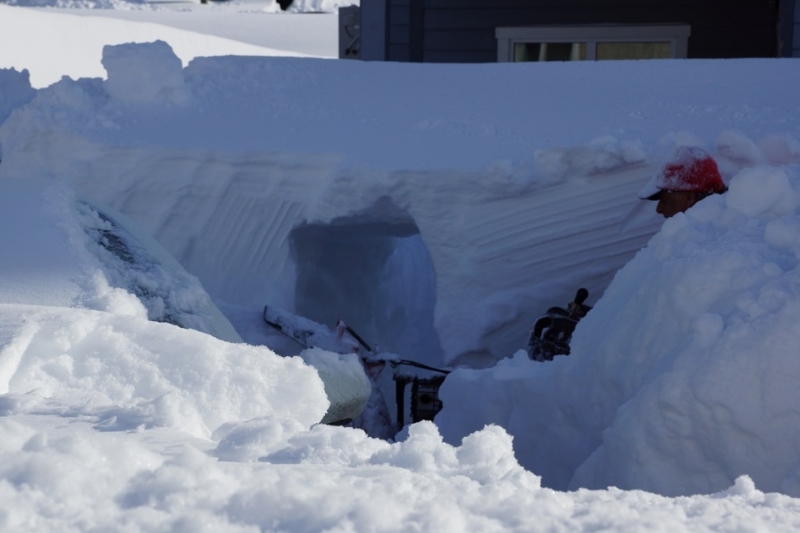 Ещё вход в дом после метели, через лаз. Справа идёт дворник со снегоротором