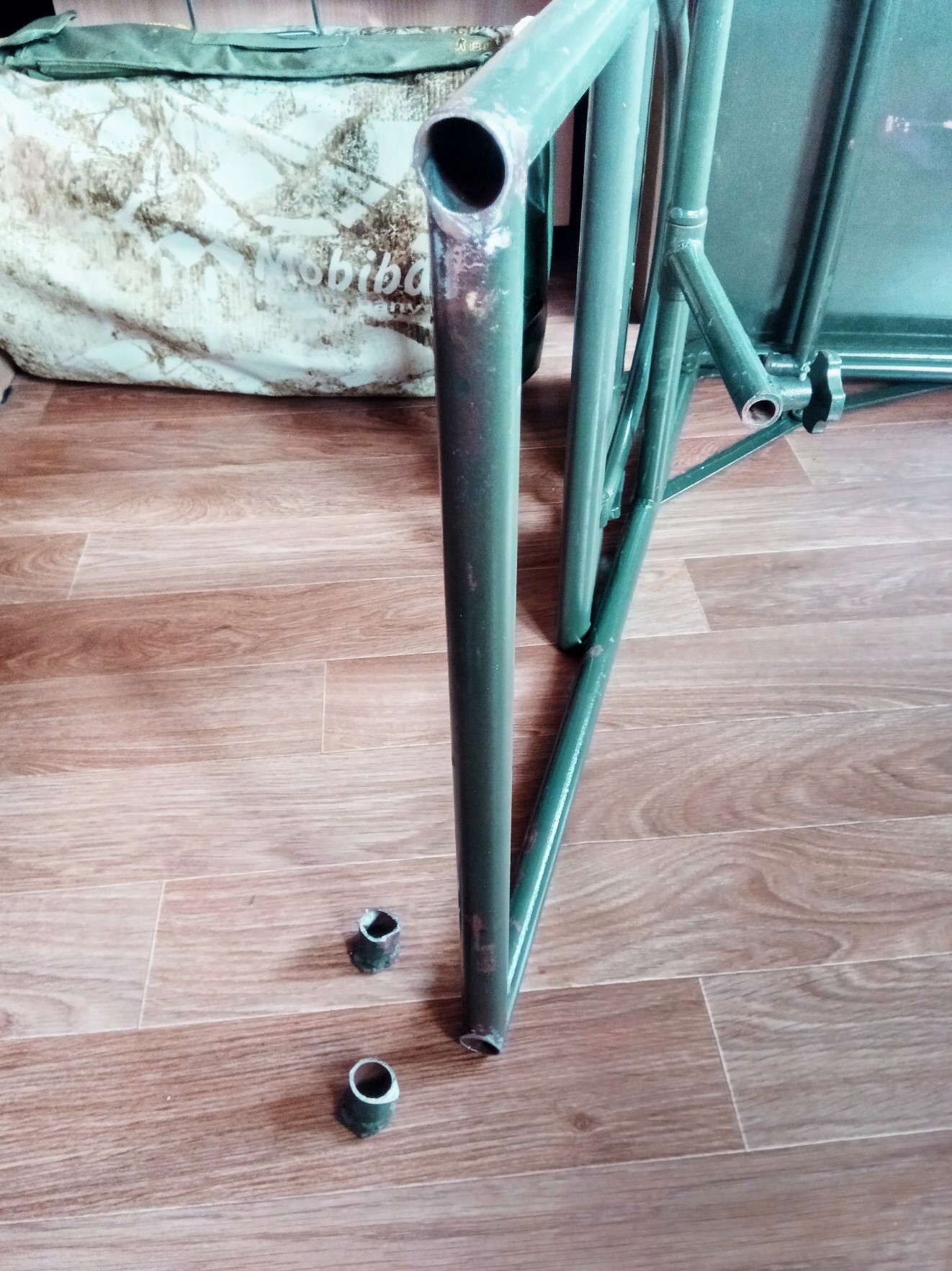 Все бы ничего, но ножки полока от Мобибы квадратные, плюсом еще мой удлинитель. Посему пришлось круглое оквадратить при помощи того же профиля, разогретого в топке Согры). В итоге получилось вот так. Тройники входят плотно и держаться крепко. Но я же купил еще кусок трубы! Зачем? Чисто теоретически - увеличивает площадь опоры.... Практически - подумал, а куда пихать эти тройники? Да так, чтоб потом вспомнить где они?
