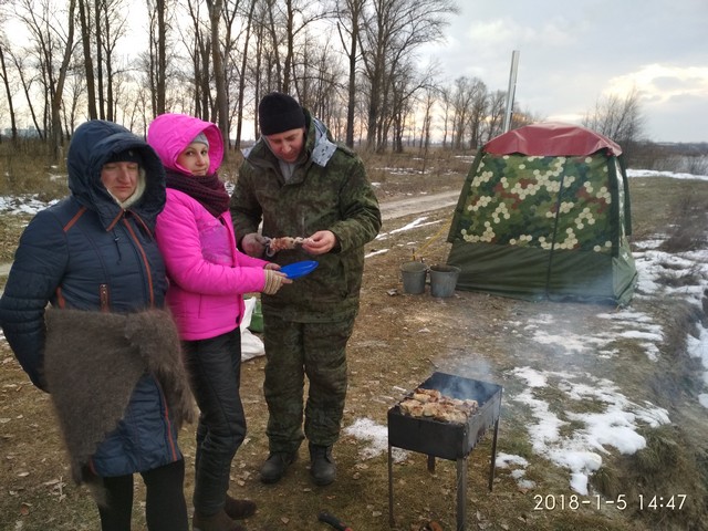 Вторая попытка оказалась удачной. Мы расположились на возвышенном берегу реки, но с удобным спуском. Плохо, что вода замерзла. Пришлось прорубать лед, чтобы набрать воды и, возможно, окунуться. Также промерзла и земля. Вот тут мне и понадобились хорошие колышки, что отец подарил. «Кайфандру» уже собирали без инструкции. С утеплителем на полу и полоком в этот раз стало намного уютнее. Вот только в мороз печь разогревается немного дольше. Но пока там все разогревается, шашлык уже готов – можно приступить к застолью.