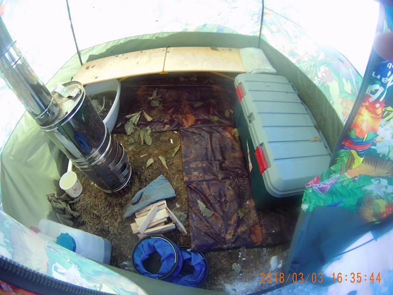 На заранее установленное место устанавливаем Кайфандру. Второй раз – еще быстрее и проще. Юбку и теплый пол пришпиливаем к мёрзлоё земле саморезами при помощи шуруповёрта. Средние и верхние растяжки – к вмороженному в снег штакетнику (ну – если быть точнее – к доскам от обрешетки, кстати тоже мобибийской от какого-то изделия. Уже поставив дымоход вспоминаю про ИЗН. Блин, забыл. Ладно, будем без неё.
