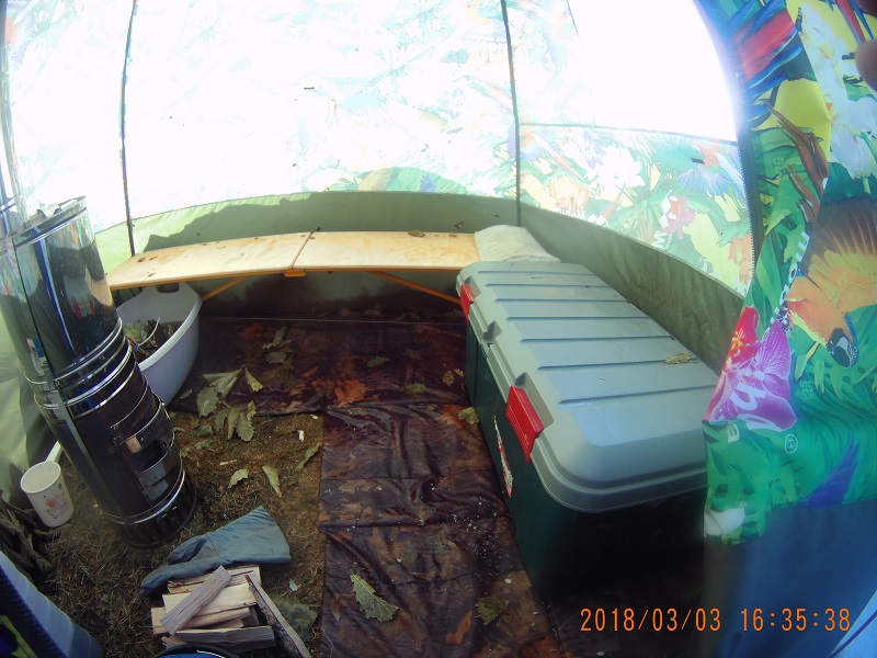 Из находок – транспортный пластиковый бокс RV-box, на 85 литров. У нас такие боксы очень популярны для автомобильного туризма. В мой УАЗик три таких бокса вставали в багажник со всяким туристическим шмурдяком поверх спальника-органайзера, а на природе использовались как сиденья. При этом если ночуешь в машине, ящики легко убираются под машину. Они достаточно герметичные и достаточно прочные. В Кайфандре ящик набивается дровами и ставится перпендикулярно полку ПСН-350. Получается отличное сиденье (два человека могут сидеть на одном ящике) и хранилище для приличного объема дров. Думаю, два таких ящика могут с успехом заменить полок, при необходимости.