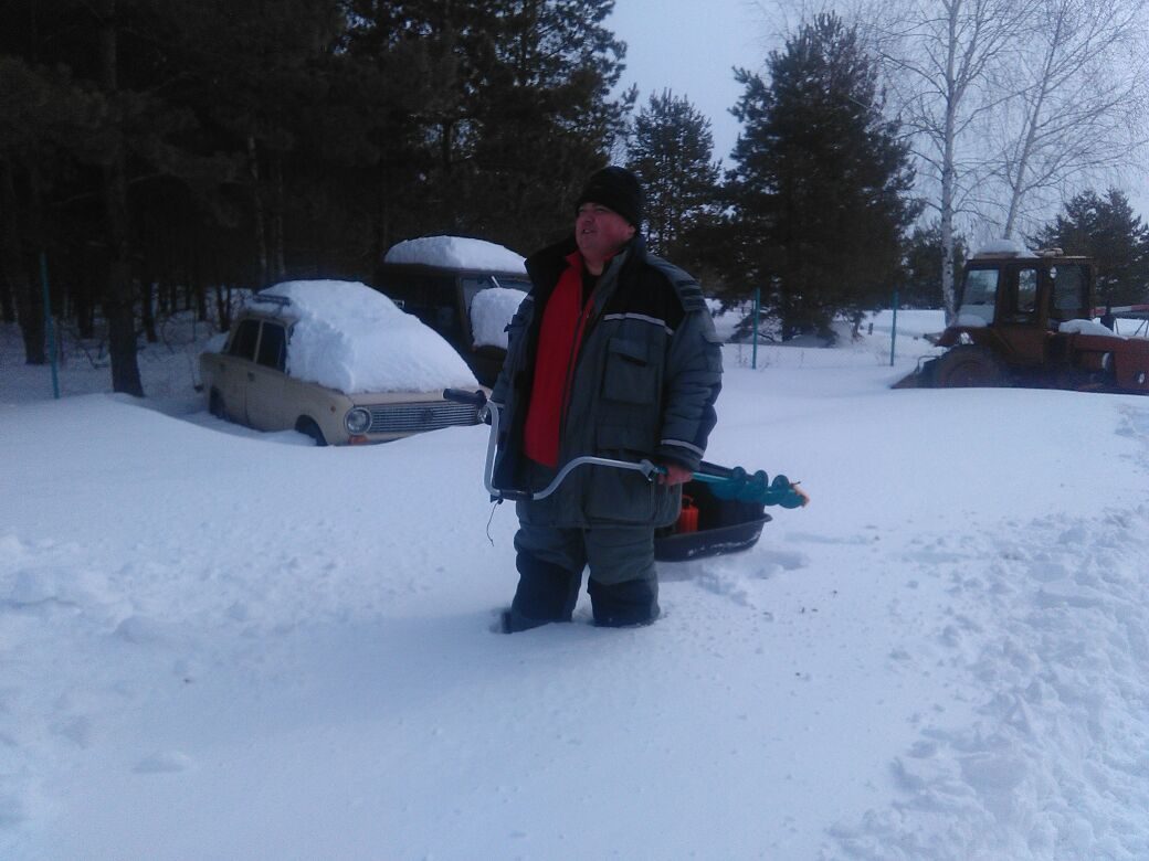 Мы с Александром пошли устанавливать жерлицы. Лед толщиной почти до ручки бура. Очень рыхлый, в самом конце застревал. Так что набурить 25 лунок было целым подвигом, руки гудели. К сожалению не все жерлицы смогли поставить, большая часть жерлиц Мобильного остались дома. Так что в привлекательный затончик жерлиц не хватило поставить. А там то на следующий день и поймал кто-то из соседних рыбаков щуку килограмм на 8. У нас к сожалению только пара сработок, но по нулям. Но у нас с собою было.