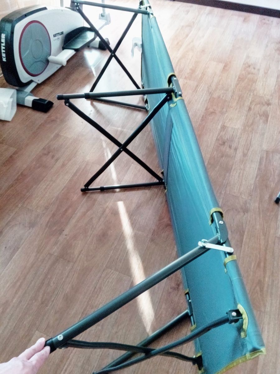 Ура! Волевым решением приобрели наконец-то и мы раскладушку, а точнее пока две. Будем уходить от надувных матрасов))), уж больно с ними морока! Хоть и написано на них 110 кг, по ощущениям выдержит легко и больший вес, да и трубы из которых она сделана не хлипкие. Вот собственно и одна из них: