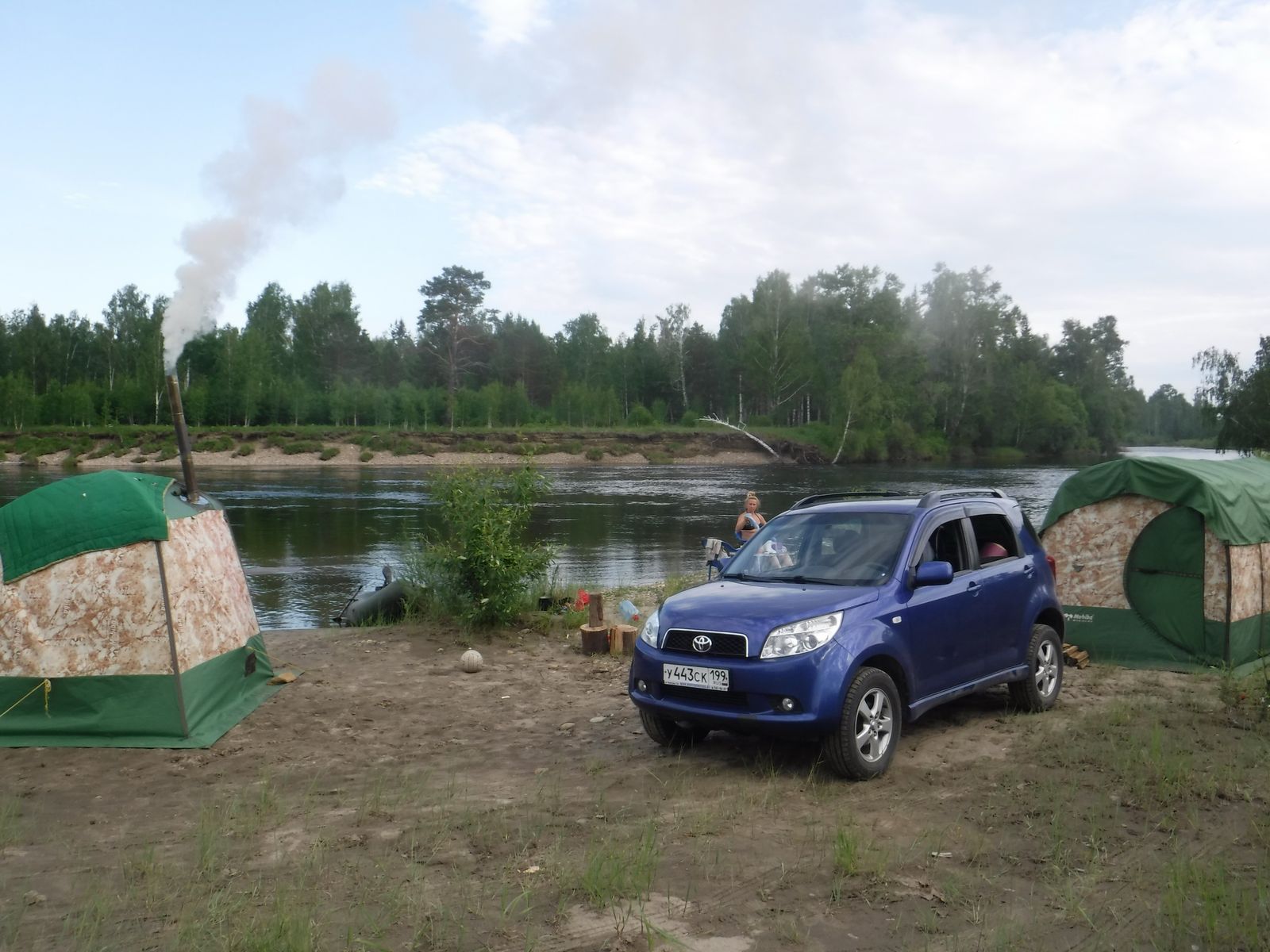Итак, выдвинулись мы 13-го на наш песчанный пляж на реке Белой на две ночёвки. 55 км, 10 из которых заболоченные лесные дороги. Однако вместо песка после дождей и наводнения нашли лишь топкий берег. Поэтому жилую 104-ю поставили на камнях, а банную десятку прямо на сыром песке.