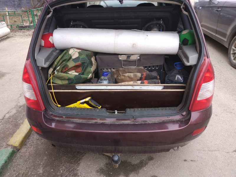 Укладка Калины. Сама мобиба с каркасом в авто боксе. Ещё в автобоксе 2 пачки брикетов, рулон фольгированного пола 8 мм, веник. В багажнике: Медиана 5, Парофон 3, Шикардос, 2 скамьи, 15 литров питьевой воды, мешок углей, ящик с камнями и мелочью, синяя сумка Икея, набитая, детский стол, ящик с инструментами, второй рулон фольгированного пола 8 мм и мелочи, такие как решётка гриль, шампура, ножовка, топор, перчатки и всякие автопринадлежности. В салоне ехали я, жена и двое наших детей.