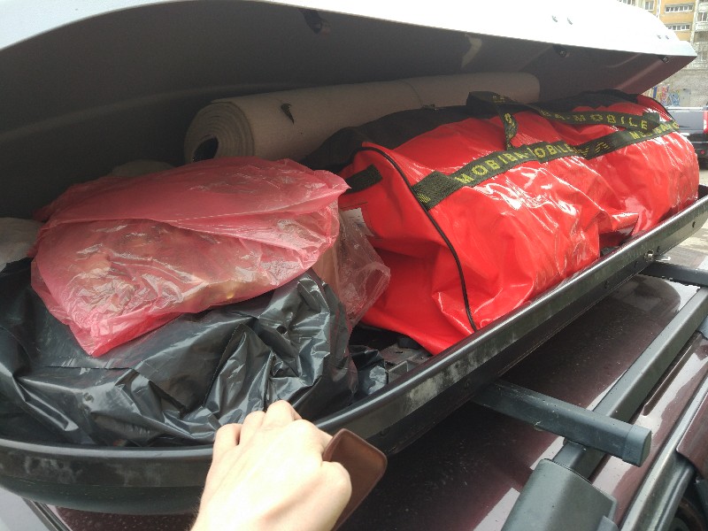 Укладка Калины. Сама мобиба с каркасом в авто боксе. Ещё в автобоксе 2 пачки брикетов, рулон фольгированного пола 8 мм, веник. В багажнике: Медиана 5, Парофон 3, Шикардос, 2 скамьи, 15 литров питьевой воды, мешок углей, ящик с камнями и мелочью, синяя сумка Икея, набитая, детский стол, ящик с инструментами, второй рулон фольгированного пола 8 мм и мелочи, такие как решётка гриль, шампура, ножовка, топор, перчатки и всякие автопринадлежности. В салоне ехали я, жена и двое наших детей.