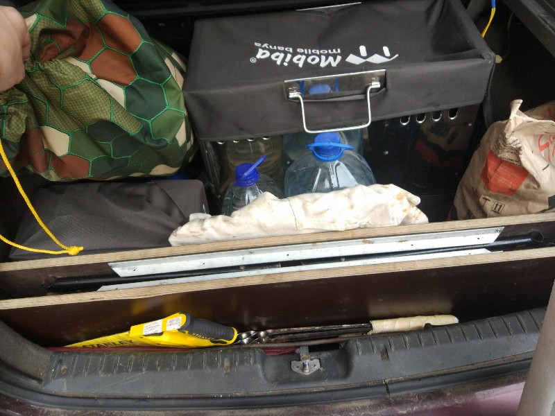 Укладка Калины. Сама мобиба с каркасом в авто боксе. Ещё в автобоксе 2 пачки брикетов, рулон фольгированного пола 8 мм, веник. В багажнике: Медиана 5, Парофон 3, Шикардос, 2 скамьи, 15 литров питьевой воды, мешок углей, ящик с камнями и мелочью, синяя сумка Икея, набитая, детский стол, ящик с инструментами, второй рулон фольгированного пола 8 мм и мелочи, такие как решётка гриль, шампура, ножовка, топор, перчатки и всякие автопринадлежности. В салоне ехали я, жена и двое наших детей.