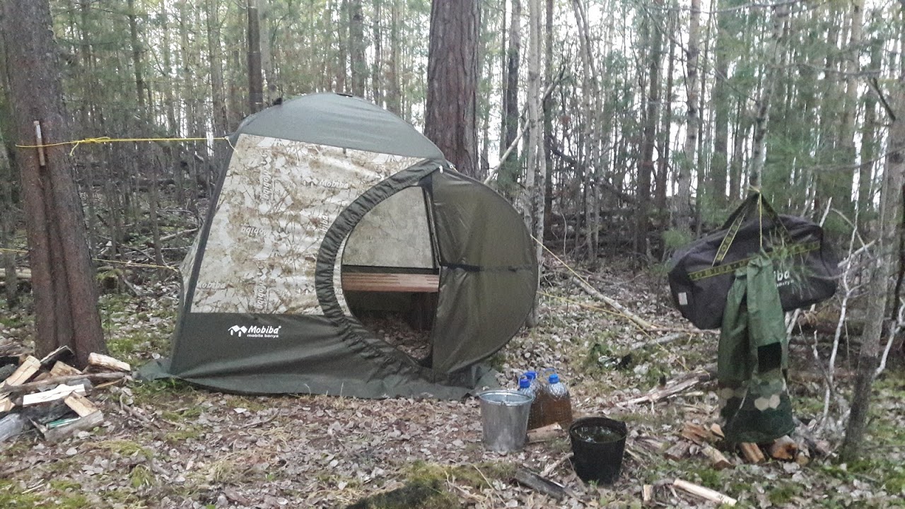 Парились часов 5, заныривая в речку после каждого выхода из бани. С камнями температура в МБ-10А поднималась до 110гр. Это было очень жарко! Все приседали на пол,когда поддавал на каменку.В общем друзья оценили! Хотя в начале как то не решались, думали что за баня в палатке :)