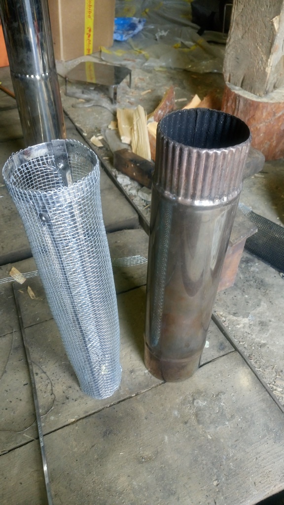 Немного дофэншуил сеточку. Но это еще не окончательно. Промахнулся. Сделал маловатый заход на трубу. В принципе держится, но надо увеличить. Каркасик сделал из найденных в гараже, дешевых шампуров. Размер такой, чтоб влезала в стандартный 90мм сегмент дымохода. По длине - как сегмент. Примерка на дымоход Жиги На законном месте, На КЦ-2 А вот дальше дикие эксперименты.