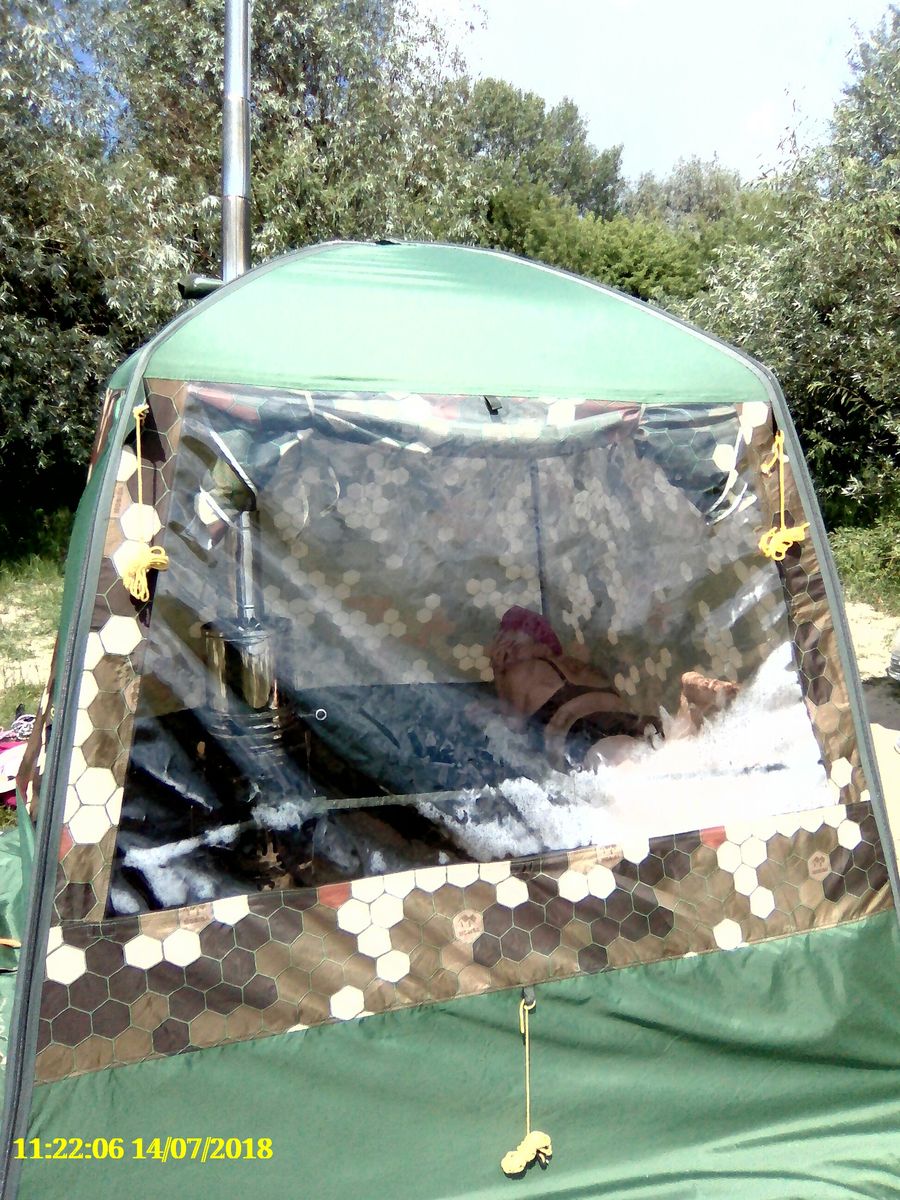 Мобиба в водном походе, это не только комфорт. Но и незабываемые банные процедуры! Мы проходили пороги, которые заливали нас ледяной водой. Баня же это быстро исправляла. Буквально 20-25 минут времени на установку (вдвоем) и растопку печи в МБ-104 и ты уже в теплом помещении. И это когда на улице около нуля, а то и ниже и ты весь промокший.