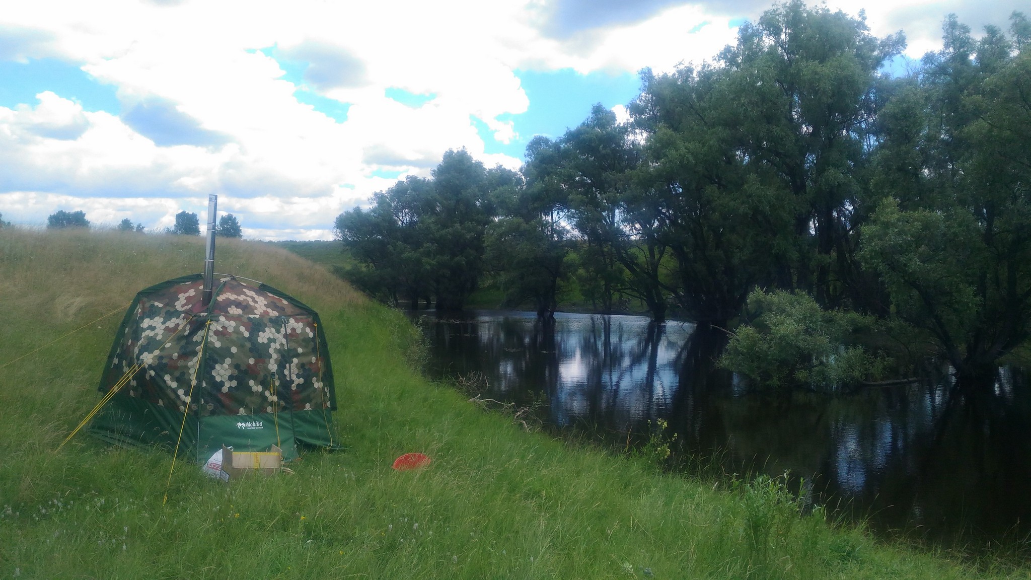 Поставил баню на колья, внутрь установил полок для кайфандры на 500 мм (кстати все не подготовлю обзор "полок в концепции кайфандра") и пол дня кайфовали - попеременно купаясь в прохладных водах Омки. Вода, привычно для большинства Омских рек, имеет коричневый цвет, от того что эти реки имееют свое начало с торфяных болот. Но вода несмотря на цвет очень чистая и без запаха и самое главное прохладная - а значит бодрит. ))))
