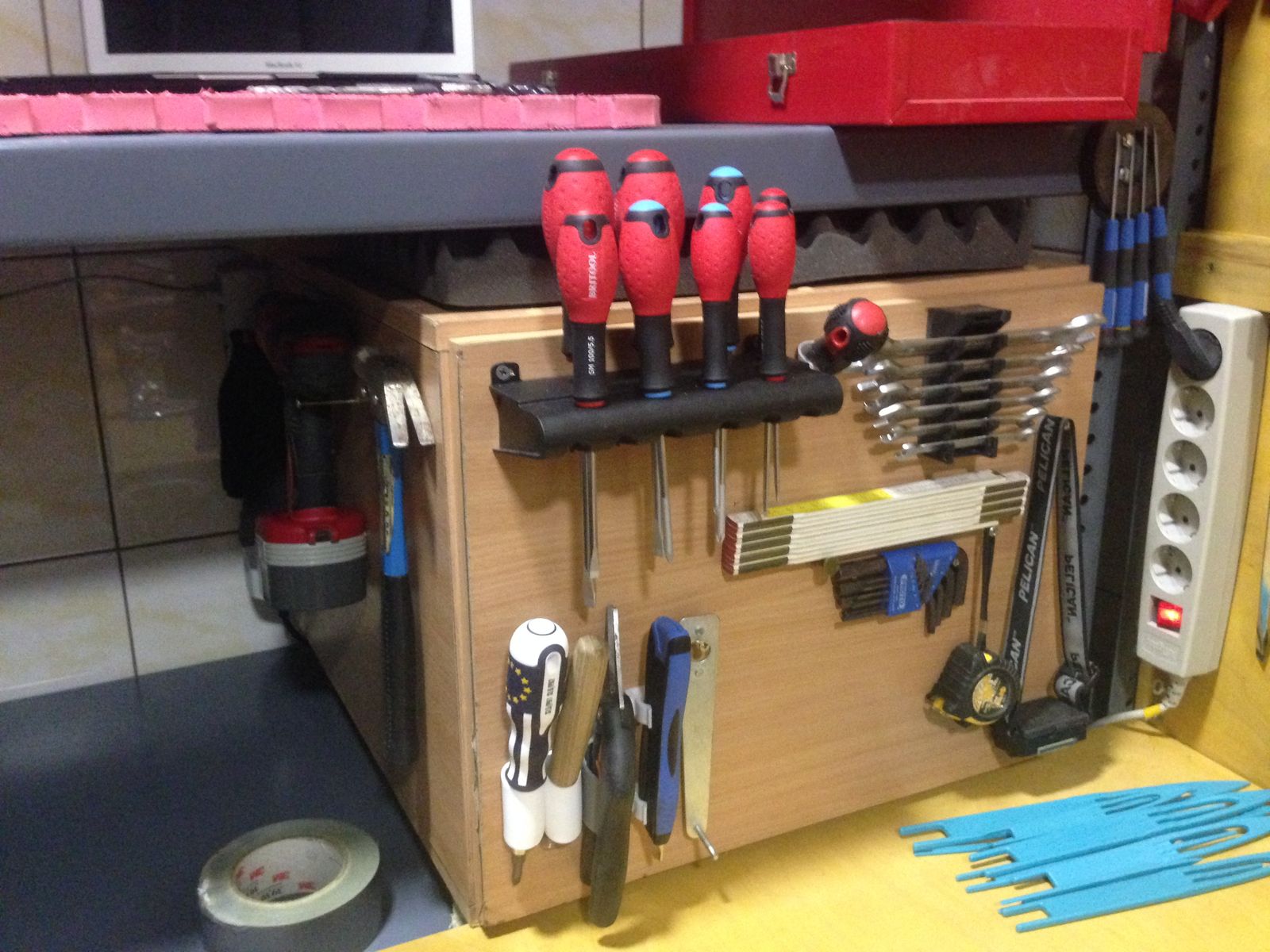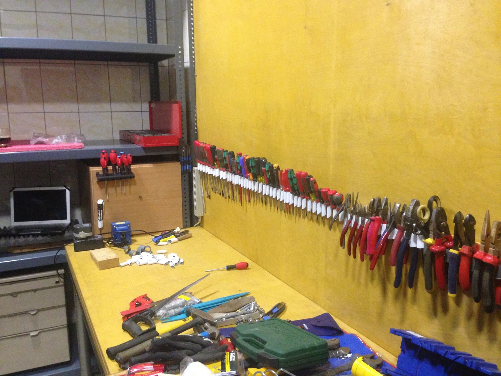 Именно тогда и возникла идея организовать рабочее место на складе с верстаком и стендом под инструмент, а его накопилось немало, причем он имел свойство валяться в разных местах (часть дома, часть в гараже и бане и часть просто на улице).