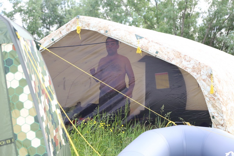 Для понимания: внутри палатки гвардеец Иван Радостев, а снаружи – жара под +50 (пару раз за экспедицию термометр доходил до такой отметки) и полчища гнуса (реально полчища, см. видео, выложенное вот здесь: http://www.mobibaforum.ru/post47867.html#p47867 второй пост на странице). За счет того, что палатка двухслойная, она не греется, а москитка во всю стену позволяет ей проветриваться и обеспечивает прекрасный воздухообмен. Даже в такую жару в палатке комфортно и прохладно. В прошлом году, к слову, я с подобным «эффектом термоса» (двухслойные палатки в жару) сталкивался в МБ-22 на Шаманке (я, помнится, об этом в «таёжке» писал, при этом сравнивал ее со стоящей рядом МБ-104) и был им немало удивлен: физику процесса представляю, но не думал, что это работает так эффективно. Так вот в Р-44 это работает еще лучше: не только прохлада, но и ветерок! Так что те «молодые загорелые Палычи», которые покупали партию Р-34 для использования в Уганде (http://www.mobibaforum.ru/post47890.html#p47890 10 пост на странице) – совсем не дураки, а взяли именно то, что нужно.