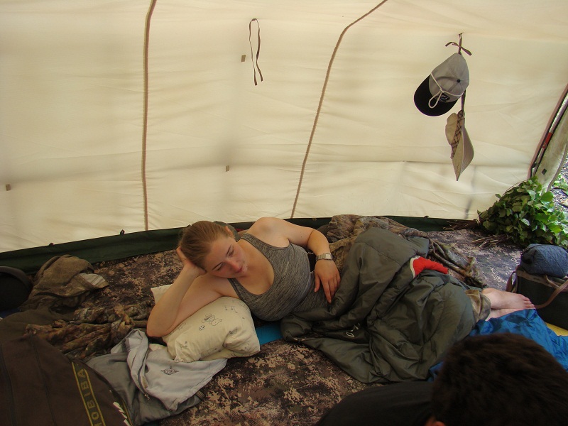 Опять же, имхо, в Р-34 в царских условиях и на сколь угодно длительный срок могут разместиться 4 человека, при этом возможность использования палатки в виде камбуза, кают-компании и мастерской для мелких работ (чистка оружия, возня с боеприпасами, обдирка шкур и пр.) полностью сохраняется. Если ужаться с царских условий на просто комфортные, то это количество можно увеличить до 6. Р-44 дает такую возможность уже шестерым/восьмерым. Подчеркну, что речь идет о постоянном проживании и работе, когда нужно не просто абы как переночевать одну ночь, а полностью восстановить силы, просушиться и переделать кучу хозяйственных дел в теплом просторном и сухом помещении.
