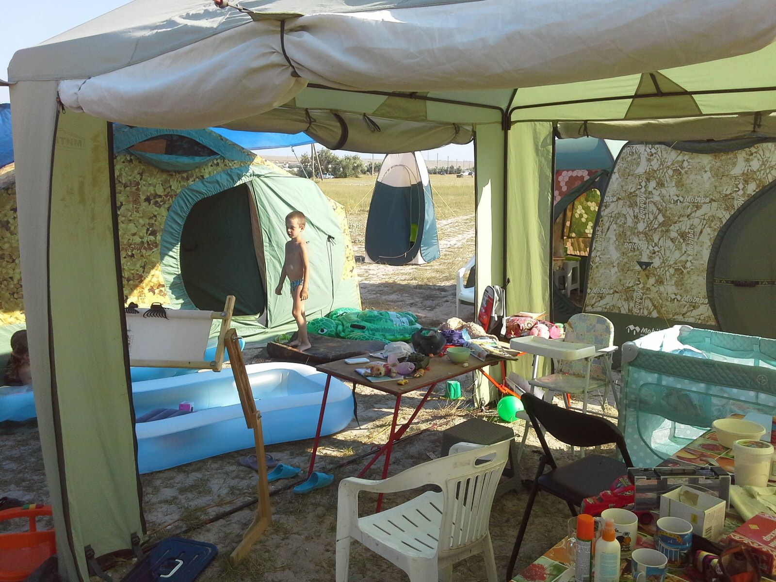 Во-вторых, пришлось разбираться с утяжными стропами. Их в комплекте четыре, по две, разных размеров. Инструкции к данному изделию не было, поскольку оно экспериментальное; но, в общем-то, не очень-то и хотелось!))) Методом научного тыка (зачеркнуто) проб и ошибок было выяснено, что длинные ремни должны становиться на боковые стенки, а короткие – вдоль скатов… или поперек, тут уж как посмотреть; в общем, поперек торцов палатки, от двери до предпоследнего шпангоута. Не знаю, прав я, или нет (если не прав, то Шеф меня поправит), но ремни эти полностью аналогичны таким же ремням из комплекта Р-34. Потому и натягиваются не до торцевого, а до предпоследнего шпангоута. Для чего это сделано? О, вот тут-то и кроется главная «фишка» данного изделия! Помните, выше я говорил, что у «Мобибы» всегда есть чем удивить? Вижу, помните. Так вот, главная особенность Р-44 в том, что задняя (дальняя от входа) торцевая стена у палатки… съемная! Да-да, вы не ослышались! Эта новинка повышает функционал изделия в разы: зимой это полноценная двухслойная палатка, летом – жилой модуль с панорамным (во всю стену!) окном из москитки, либо вообще «пляжный зонт». Как тебе нужно, так палатку и используй, в зависимости от сезона и настроения. Например, вот так: