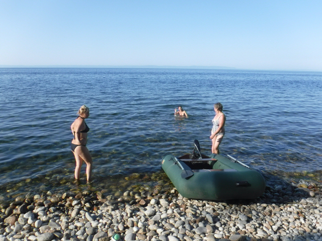 На второй и третий день топили баньку, купались и плавали на лодочке. Только успевали аккумуляторы менять с разных машин на лодочный электромотор. Сразу скажу, что дети все без исключения отлично плавают (занимаются в секции плавания), да и катали мы их только по мелководью. Сами же забирались на километр покачаться на волнах. Ради интереса мерили глубину. 200 м от берега - 10 метров, 400 м - 20, 600 метров - 30 метров троса не хватило. В этом месте ширина Байкала около 50 км и в ясную погоду тот берег просматривается, а ночью в бинокль видны огни Листвянки.