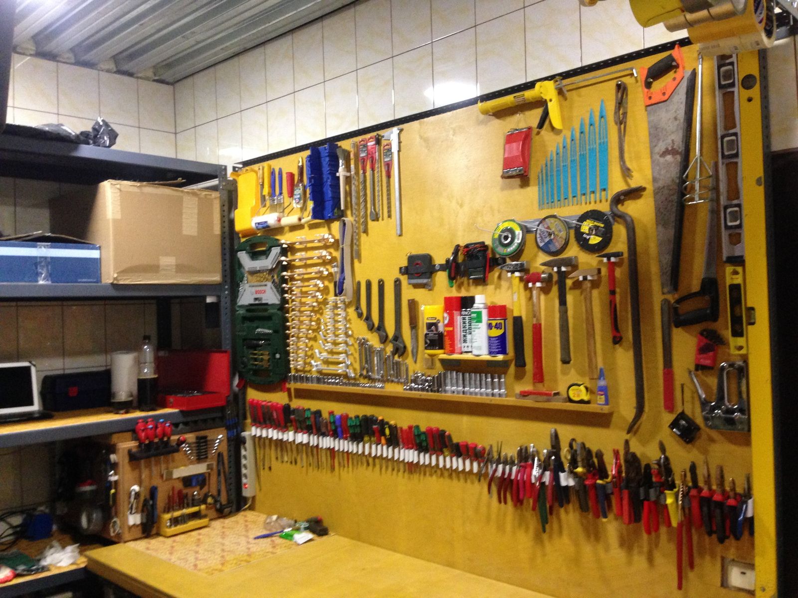 Именно тогда и возникла идея организовать рабочее место на складе с верстаком и стендом под инструмент, а его накопилось немало, причем он имел свойство валяться в разных местах (часть дома, часть в гараже и бане и часть просто на улице).