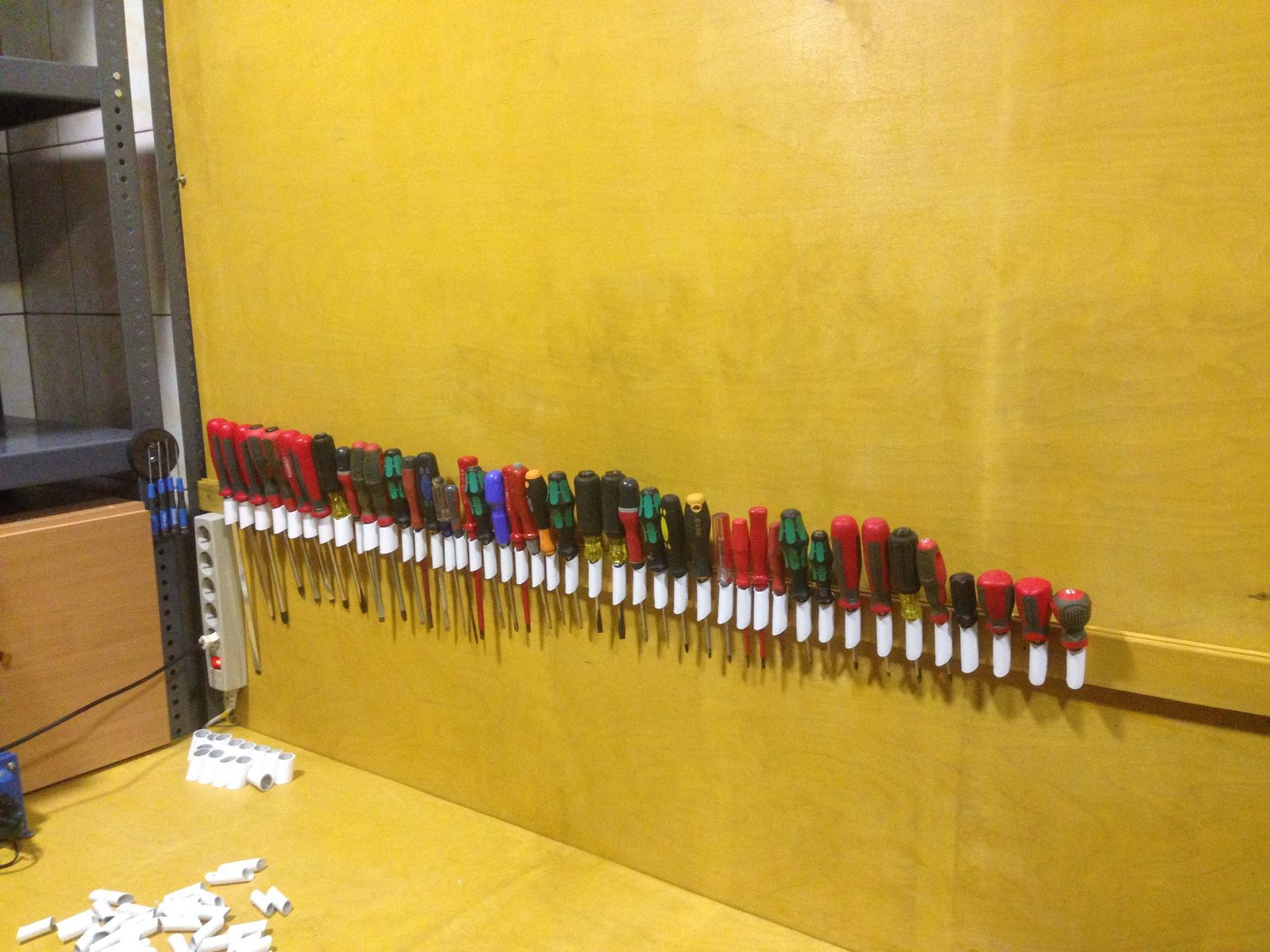Именно тогда и возникла идея организовать рабочее место на складе с верстаком и стендом под инструмент, а его накопилось немало, причем он имел свойство валяться в разных местах (часть дома, часть в гараже и бане и часть просто на улице).