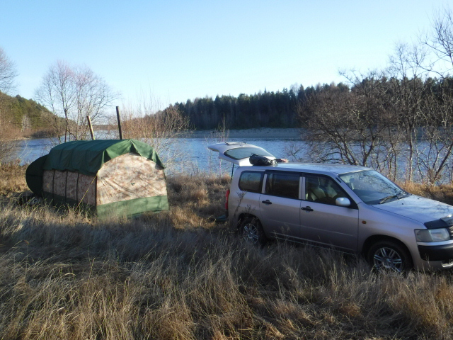 Местные говорят, что косматые парни улеглись, только один ещё где-то бродит. Следов не видели, но выход из палатки обустроили прямо напротив двери в машину. Ну и песни вечером орали очень громко. Кое-кто утром совсем не хотел вставать, а потом полдня валялся на кровати. Температура днём -12..-16, вторую ночь приморозило конкретно. В 2 часа ночи, когда снимал аккум с машины было -23. Утром у авто перемёрзли патрубки на радиатор (антифриз - г). В первую ночь полностью забитой дровами Согры хватало на полтора часа, вторую ночь - на час и десять минут. Диск приточки был открыт на одну треть, если чуть меньше - палатка не прогревается, даже учитывая то, что мы дополнительно утеплились, положив большое одеяло на палатку и накрыли допкрышей в "спальном отделении". Понятно, что это крайние температуры для однослойной 104-й. Молнии побрызгал силиконовой смазкой, но при демонтаже низ двери и пару дальних шпангоутов всё равно пришлось отливать кипятком.