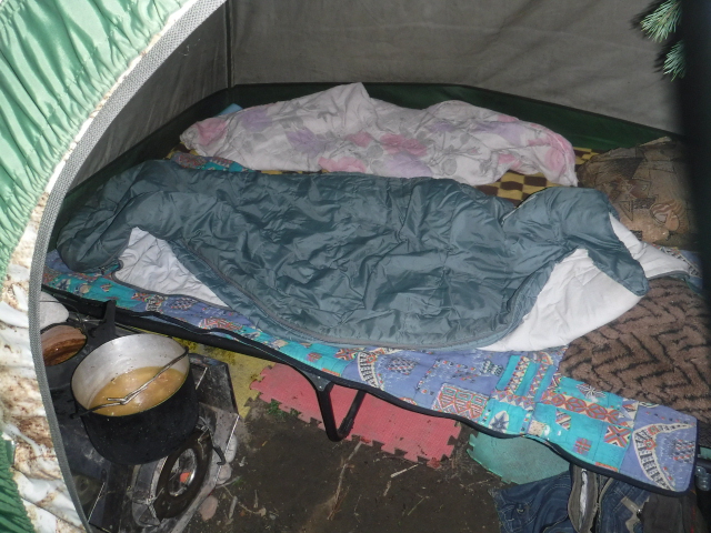 На ночь столик выносится и ставим раскладушки. Они у меня двух типов: подростковые 180х50 и кемпинговые 190х60. С последними приходится поколдовать, чтобы вошли, а Согра стоит от раскладушки в 5 см.