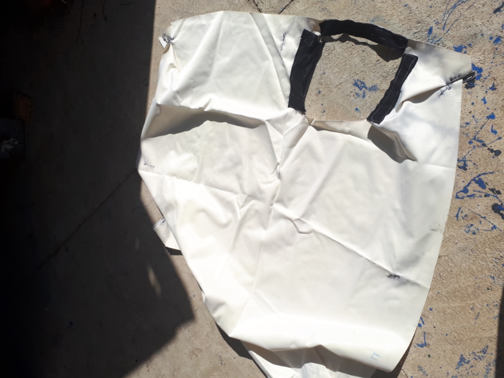 Поставил МВ10 - накинул - и давай кроить. Отрезал по краям крыши. уголки чуть подшил (по уму конечно надо было разрезать и нормально прошить, но у меня есть только иголка и нитки с ножницами и нет совсем умения, и руки не из того места). Пришил резиночки для крепления к существующим петлям МВ10. Хотел купить пластиковые крючечки, но не нашел - поэтому сделал их из аллюминиевой проволоки (надеюсь временно). к дырке вокруг трубы пришил липучку - по размерам заводской липучки.