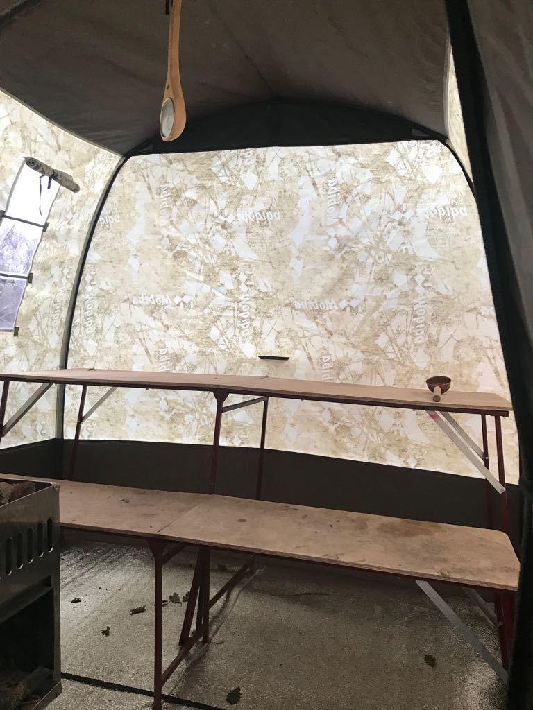 Добрались на место дислокации уже к вечеру, но темнота и усталость не помешала в десятиградусный морозец в четыре руки без инструкции собрать платку за 40 минут (с учетом расчистки снега и установки распорок), на столько все интуитивно понятно и самое главное все замочки-молнии такие крепкие, что уверенно их застегиваешь и не боишься сломать. Медиану установили без каких либо вопросов, 15 кг жадеита и кварцита были аккуратно уложены. По рекомендациям, обязательно должна оставаться щель между камнями и стенками печи для конвекции воздуха. В качестве дров использовали привезенные с собой топливные брикеты Пиникей, собственно все три дня только ими и топили, расход совсем не большой. Печь быстро входит на режим и также быстро, если проморгать кладку, из него выходит, - но благодаря каменке, тепло в парилке еще долго сохраняется и в принципе особо за печью можно и не следить. Честно говоря, при покупке мобильной бани боялся, что при нагреве ткань будет издавать посторонний неприятный синтетический запах, однако эти сомнения быстро развеялись, респект производителям Мобибы!