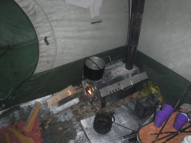 Местные говорят, что косматые парни улеглись, только один ещё где-то бродит. Следов не видели, но выход из палатки обустроили прямо напротив двери в машину. Ну и песни вечером орали очень громко. Кое-кто утром совсем не хотел вставать, а потом полдня валялся на кровати. Температура днём -12..-16, вторую ночь приморозило конкретно. В 2 часа ночи, когда снимал аккум с машины было -23. Утром у авто перемёрзли патрубки на радиатор (антифриз - г). В первую ночь полностью забитой дровами Согры хватало на полтора часа, вторую ночь - на час и десять минут. Диск приточки был открыт на одну треть, если чуть меньше - палатка не прогревается, даже учитывая то, что мы дополнительно утеплились, положив большое одеяло на палатку и накрыли допкрышей в "спальном отделении". Понятно, что это крайние температуры для однослойной 104-й. Молнии побрызгал силиконовой смазкой, но при демонтаже низ двери и пару дальних шпангоутов всё равно пришлось отливать кипятком.