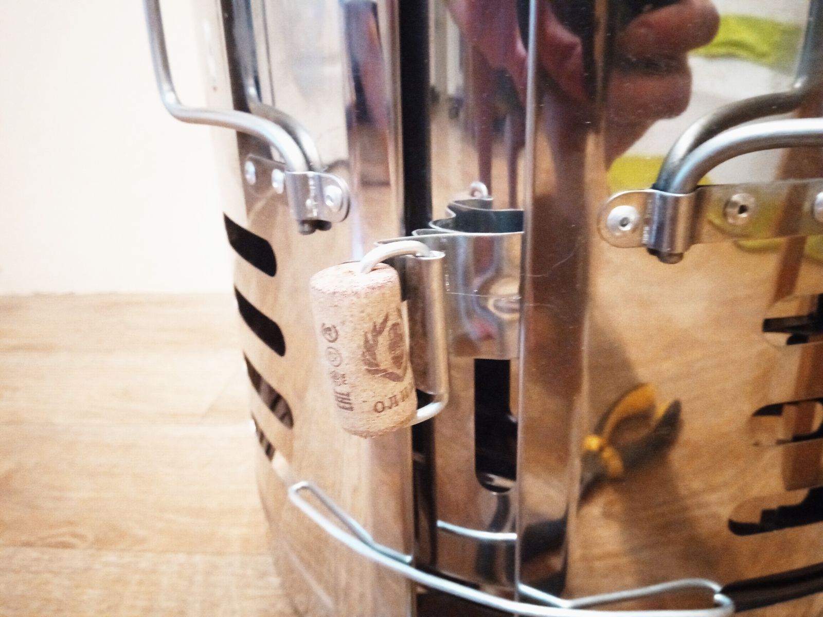 Сразу чтоб не обжечь пальцы сделал вот такую ручку, а для транспортировки такой вот крючок, дальше тоже будут улучшения, но позже. Также немного была замята корона, чему я очень рад ( в смысле что не фатально) прокатав это место подшипником большим, практически и не видно стало. В общем как-то так: