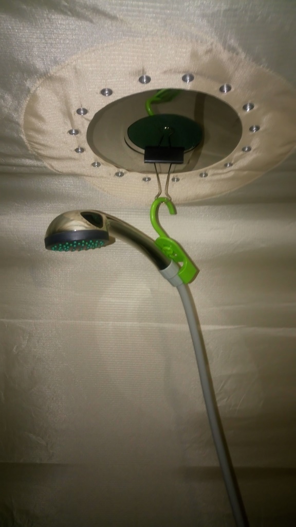 В предбаннике водрузил аккумуляторный душ. Крепление лейки – канцелярская прищепка на разделку. Ну что сказать в итоге? МОБИБА сделала мне сегодняшний день! Праздник души и тела.