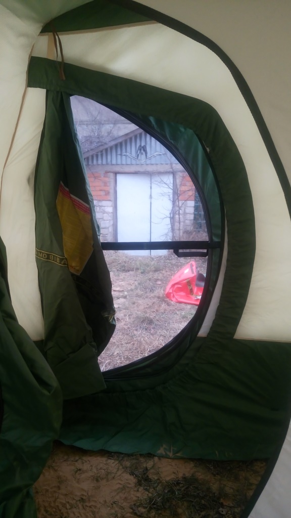 Вот для сравнения 103-я и 332-я. Сумка 332-й с приличным запасом. А приличный запас никогда лишним не бывает! Когда я ее получал в ТК, она еще в полиэтилен упакована была и ужата сильно. По габаритам сравнима со 103-й, только потяжелее))). Каркас собрался быстро. Все понятно, интуитивно. Внутренний слой навесился легко и непринужденно. Собственно, как и второй. Да, на 332-ю накидывать проще чем на ВП-33))) А окно – просто фантастика! А вот и дверь. Обратите внимание на конструктив. Дверь двухслойная, с москиткой. Сама форма двери иная, нежели на 103-й. Входить-заходить гораздо удобнее. В 103-й я несколько раз споткнулся о порог.