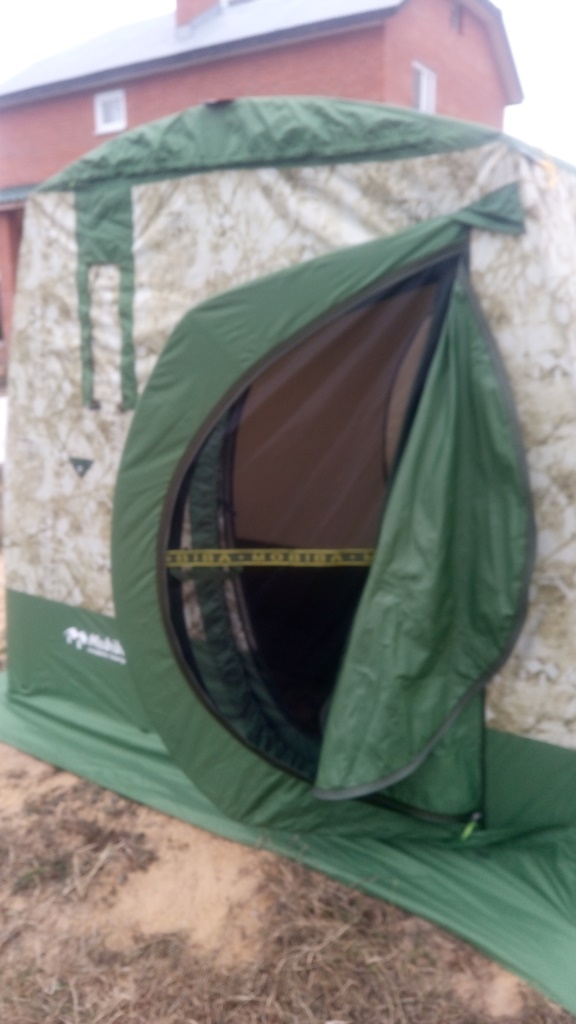 Вот для сравнения 103-я и 332-я. Сумка 332-й с приличным запасом. А приличный запас никогда лишним не бывает! Когда я ее получал в ТК, она еще в полиэтилен упакована была и ужата сильно. По габаритам сравнима со 103-й, только потяжелее))). Каркас собрался быстро. Все понятно, интуитивно. Внутренний слой навесился легко и непринужденно. Собственно, как и второй. Да, на 332-ю накидывать проще чем на ВП-33))) А окно – просто фантастика! А вот и дверь. Обратите внимание на конструктив. Дверь двухслойная, с москиткой. Сама форма двери иная, нежели на 103-й. Входить-заходить гораздо удобнее. В 103-й я несколько раз споткнулся о порог.