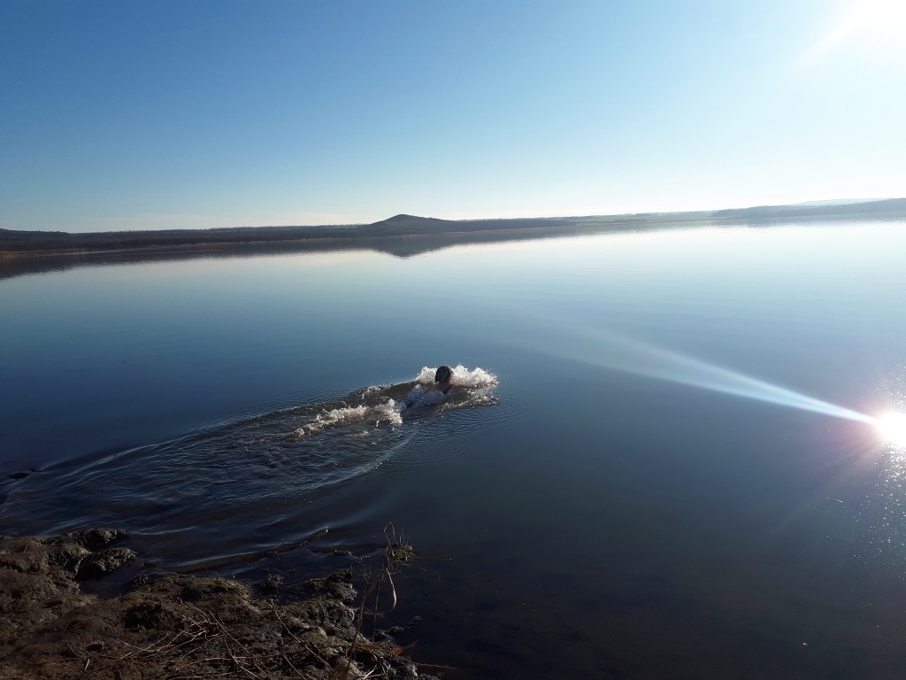 По приезду на озере и лужах был тонкий ледок, но солнце его к обеду растопило. Ныряли в воду все.