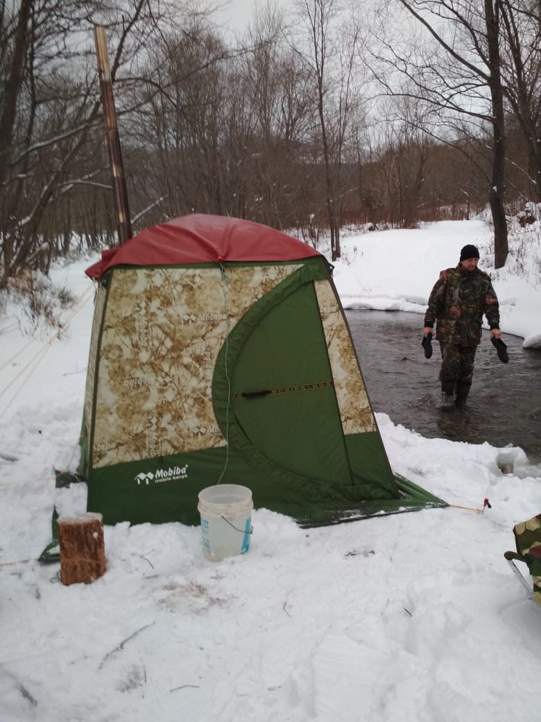 Вот и удалось испытать МБ10А зимой. Накидной тент до Нового года прийти не успел ,поэтому поставили на берегу речки с ИЗн .