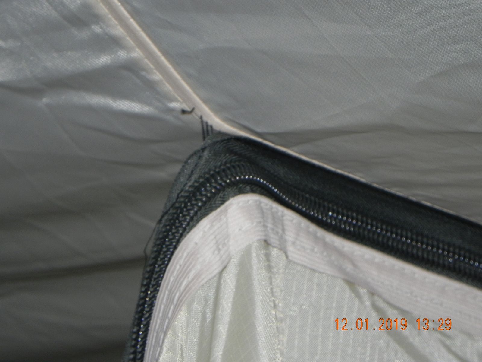 Предыдущий хозяин (Андрей) покупал заводскую вставку и к поверхности тента (в том месте где шов) частично пришил молнию, дальше сломалась швейная машинка, так и оставил.