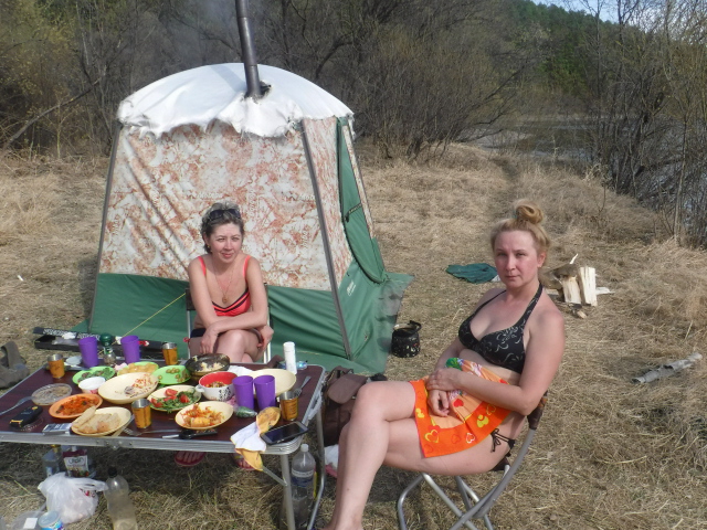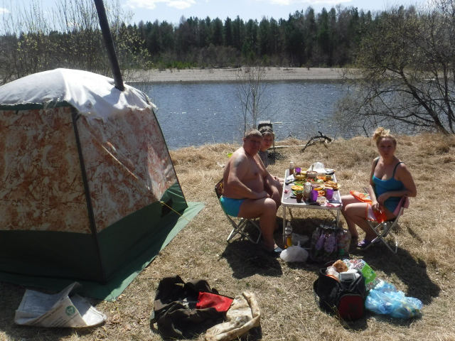 Позагорали, попарились, покупались и посидели допоздна за рюмкой чая. Ночью было +3..+5. Одной не полной закладки дров хватило до утра. Выспались на раскладушках отлично. Маленько порыбачили, но сейчас об этом низззя - нерестовый в полном разгаре, хотя рыба уже отметалась и отдыхает.