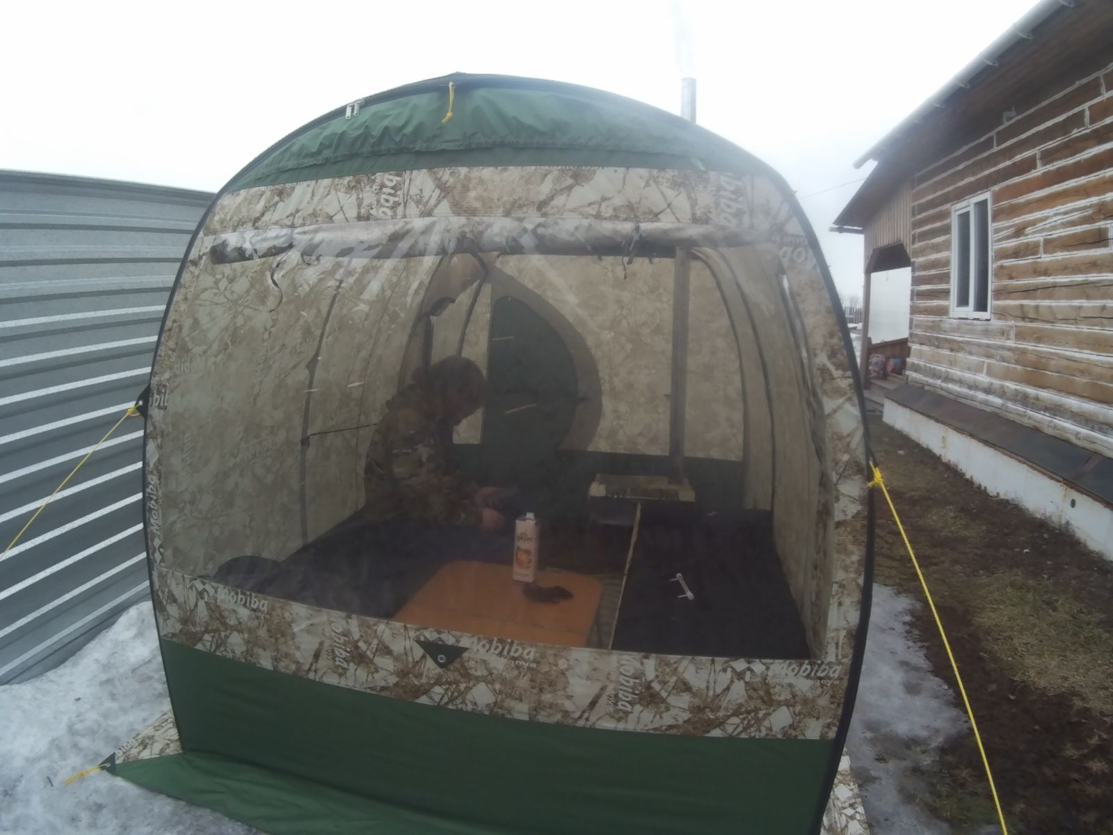 Палатка получена. Ближайший выезд запланирован на середину мая в Приисковый где она будет выполнять роль жилового домика на 3-х человек. А вот "червечки" в энном месте недают покоя. По этому было решено провести небольшой осмотр-тест прям во дворе дома. И как же не затопить печь!!! Друг с которым проводили тест, когда поставили Согру спросил- Её с какого космического корабля сняли? Первая растопка. На одной закладке поддувало ,как говорит Палыч, на двоечке почти 5 часов температура в палатке держалась 22-24 градуса при уличной температуре +1+3 Ну и как без него...надоже это дело "обшикардосить" Раскладушки сделали из 15 профтрубы и 6-ти мм фанеры. Размер 190х65х40 (ДхШхВ)
