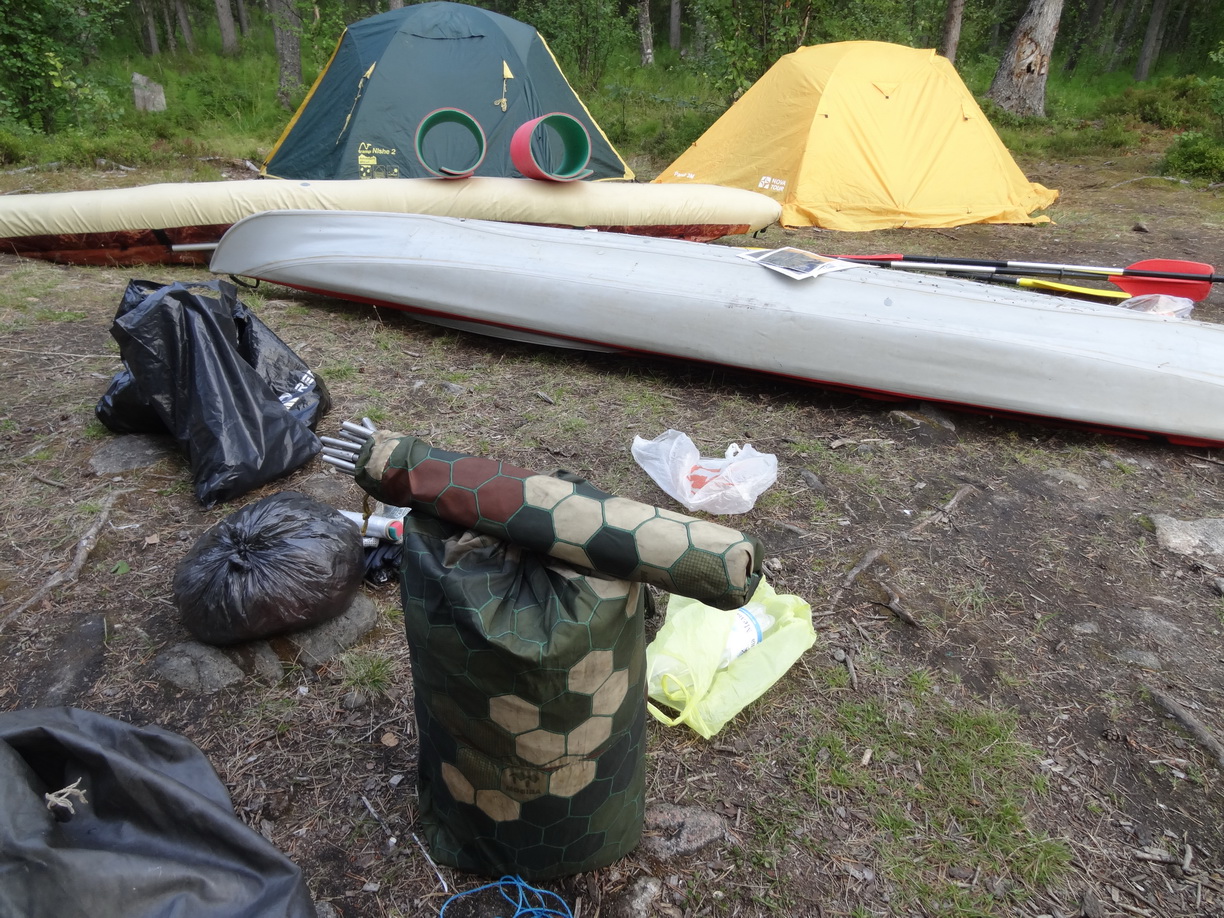 Штатная упаковка Кайфандра не годилась. С такой упаковкой возможность расположить баню только на деке. Но при таком сценарии её бы смыло в первом же серьёзном пороге. Да и высокий центр масс не приветствовался. Поэтому было принято другое решение транспортировки. Печку обматывали палаткой и помещали в чехол от печки. В доп сегмент запихивали дуги. Таким образом, вся баня помещалась внутрь байдарки. Штатный чехол с собой не брали.