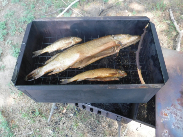 В 9 утра мы уже были на озере, занялся копчением пойманной накануне рыбы. Простенькую коптилку тупо ставлю на Шикардос. Коптить на Шикардосе очень удобно и экономично. Не надо искать кирпичи или камни под коптилку, а поддержание жара не требует никаких лишних телодвижений, как если бы это было без Шикардоса.