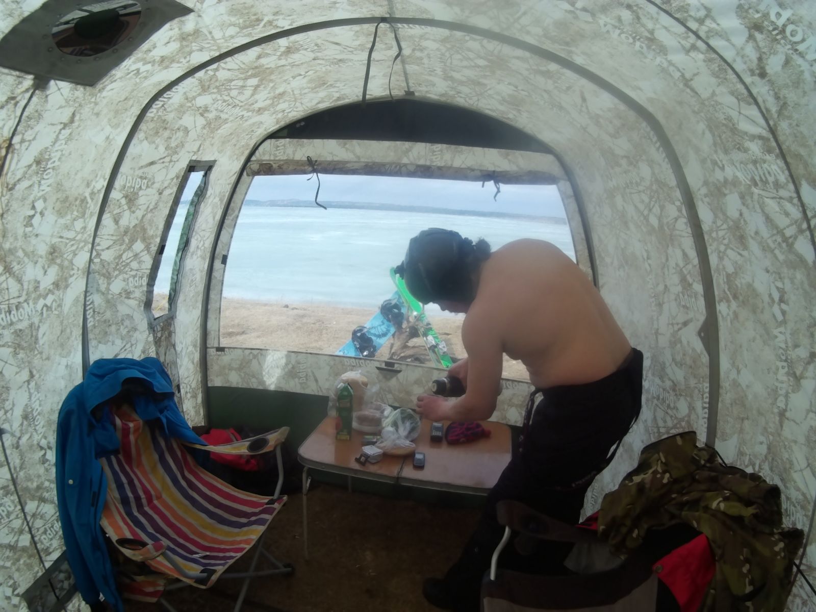 Сбылась моя мечта, МБ-103 (и именно аквариум) + Согра. Данный комплект брался в первую очередь как теплый домик при зимних покатушках на кайте. В поле или на замерзшем озере при температуре -10-12 градусов и ветре 6-8 м/с, снять куртку, посидеть в тепле попить горячего чаю- этот кайф можно сравнить тока с баней, зимой, рядом с прорубью... Также палатку планируется использовать летом в качестве бани, поздней осенью как жилую на рыбалке.