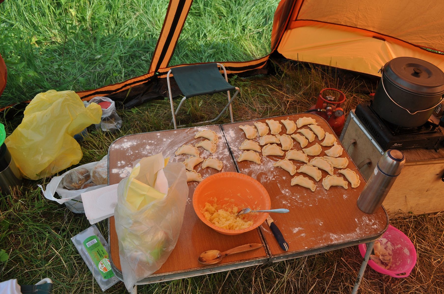 Палатка получена. Ближайший выезд запланирован на середину мая в Приисковый где она будет выполнять роль жилового домика на 3-х человек. А вот "червечки" в энном месте недают покоя. По этому было решено провести небольшой осмотр-тест прям во дворе дома. И как же не затопить печь!!! Друг с которым проводили тест, когда поставили Согру спросил- Её с какого космического корабля сняли? Первая растопка. На одной закладке поддувало ,как говорит Палыч, на двоечке почти 5 часов температура в палатке держалась 22-24 градуса при уличной температуре +1+3 Ну и как без него...надоже это дело "обшикардосить" Раскладушки сделали из 15 профтрубы и 6-ти мм фанеры. Размер 190х65х40 (ДхШхВ)