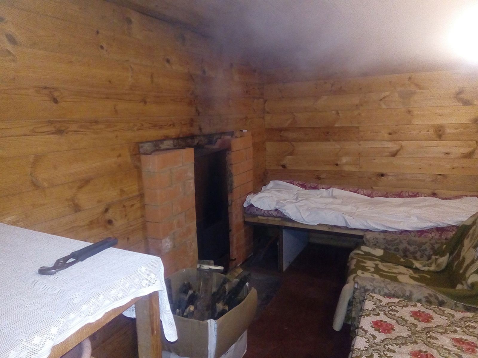 Размеры примерно 4х4,5 м. С пристройкой-тамбуром-дровником. Блин, вот теперь точно померю, самому интересно стало. Большой (в масштабе бани) предбанник-раздевалка, и небольшие (после МБ-15) парная и помывочная. Солистом всего этого недоразумения была, впрочем почему была, есть печь. Большая, железная, сварная, и это не первая ее жизнь, в некоторых местах по нескольку слоев не тонкого металла. С самого начала меня невзлюбила, впрочем обоюдно. Самый главный ее минус - крышка водогрейного бака в предбаннике. Вот так происходит когда вода закипает. Вот так печь выглядела из парной. Полок, из осины, как и вагонка, под вагонкой все обито алюминиевой фольгой (клише из газетной типографии). Вылизали дерево, вычистили каменку, вынимая слоями отходившую ржавчину. С помощью гвоздодера, молотка и какой-то матери вытащил заслонку. Кучу времени убил на попытку очистить от ржавчины и довести до приемлимого состояния бак для воды. В первый раз мылись желтоватой водой, которая за несколько минут до точки кипения резко мутнела и меняла цвет на оранжевый, а после прекращения активного кипения становилась попрозрачней, и хлопья ржавчины водили в ней хороводы.