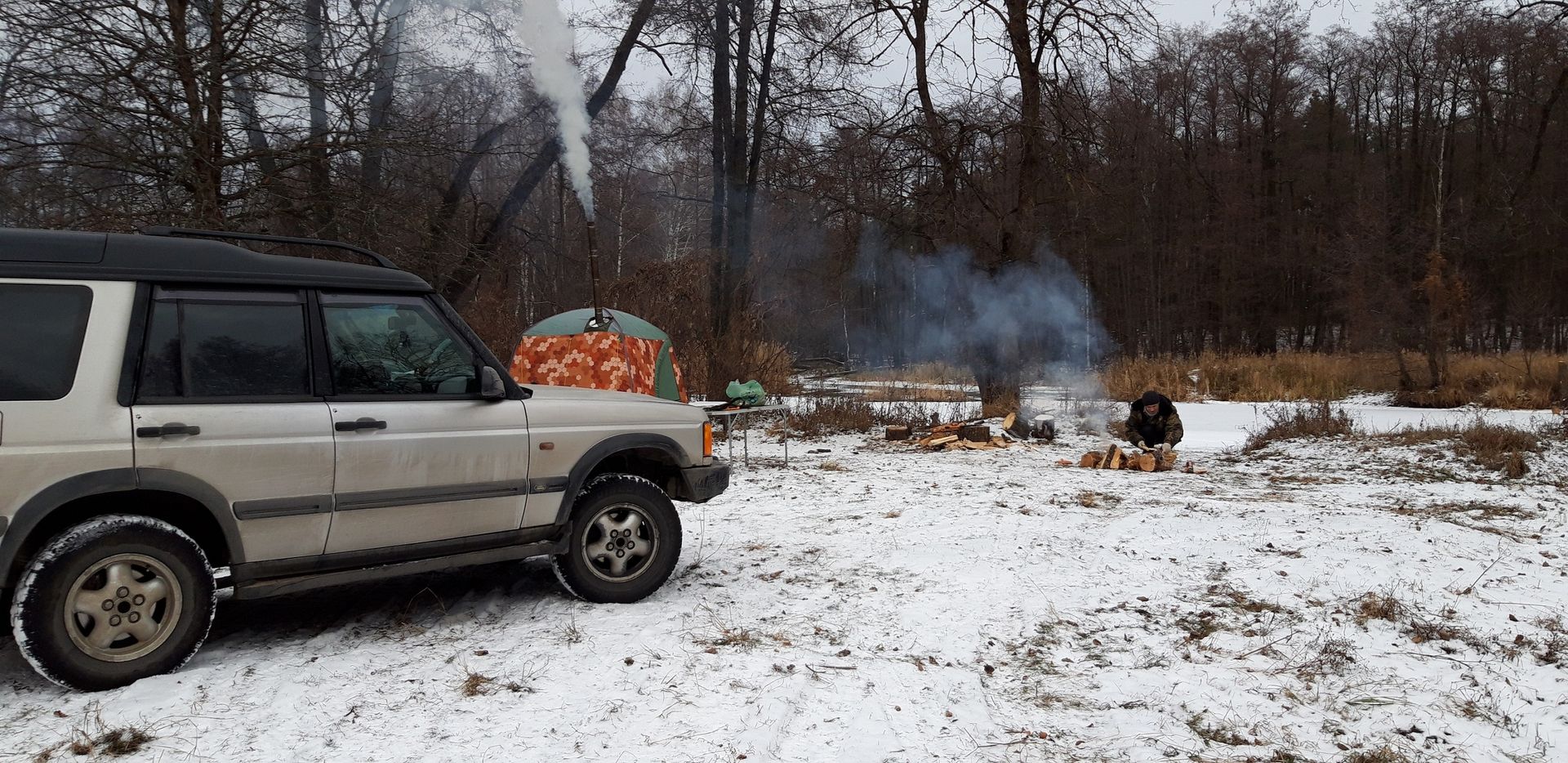 В большинстве случаев один, но порой и с супругой езжу. Но с ней только летом, а там уже палатка, да вот на север съездили))