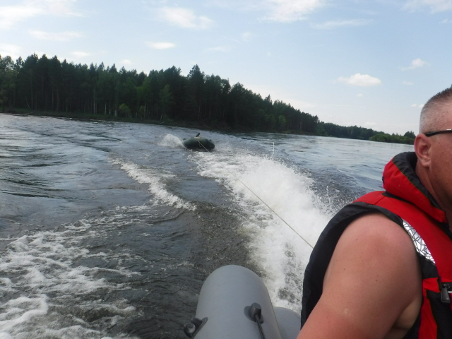 На второй день у нас начались "сюрпризы". Сначала мы потеряли спиннинг, вернее не потеряли, а но, зацепившись настроем за топляк, просто выстрелил из лодки. Найти его на течении в мутной воде не получилось. Затем умер аккум от электромотора, и нам представилась перспектива 6 часов чапать вёслами до места прибытия за нами авто. Но тут к нам подплыли ребята и предложили помощь. Парни представились зелёными, но были слегка "синие", но это не помешало нам в дружной компании проделать оставшийся путь на прицепе. Мы переместились в их лодку, а мой Марлин прицепили на трос. Их СИАПРО 40 сил этого почти не почувствовал.