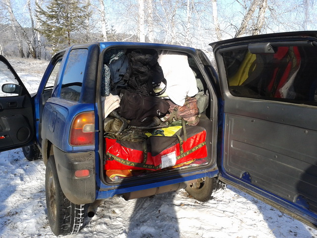 Зима! Крошечный, но при этом обалденный РАВ4 коротыш (3 двери), На рыбалку втроём с Мобибой (с ночёвкой). Только надо вдумчиво и не торопясь всё уложить. В багажнике Согра, Медиана и 104-ка.