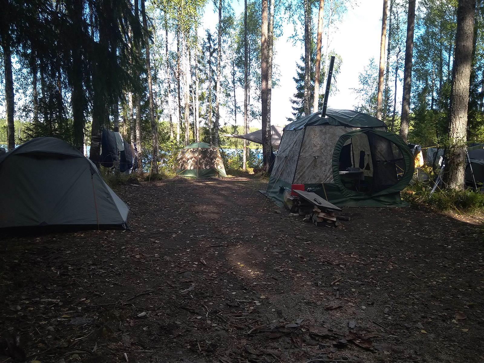 В первый же вечер кроме палаток поставили Пятнашку с Согрой, в которой кроме самой печи отлично поместились еще два стола и осталось место для 7 табуреток, благо мы все худенькие.)) Вместо скатерти на столе карта озера и окрестностей. Сначала хотел сделать лагерь на каком-нибудь из островов, но как показала утренняя разведка, место, которое мы заняли, оказалось самым удобным для нашего табора. И было принято решение оставаться тут и начать уже отдыхать (хотя мозг перешел в режим «отдых» при посадке за руль в самом начале). И поставили Десятку с Паробомбой. Лавочку в ней соорудил только на следующий день. Рыбалка была предсказуемо не трофейная. Раз есть подъезды, значит есть местные с сетями. Правды ради надо сказать, что сетей не много, и те, что я видел, регулярно проверялись. Они же (местные) говорили, что ловится лещ и язь до килограмма, но мы приехали со спинингами, нацеливаясь на окуня и щуку. Окуня в озере полно, но мелкий. 300 грам это уже прям отличный окунь. Щуку ловили до 2-х килограмм. Копченой рыбой обеспечены были весь отдых. Ну и дети удовольствие получили, погоняли окуней. Да и сам я пару раз оторвался, брал количеством поклевок. Потом надоело. Ни одного фото рыбы нет.))))