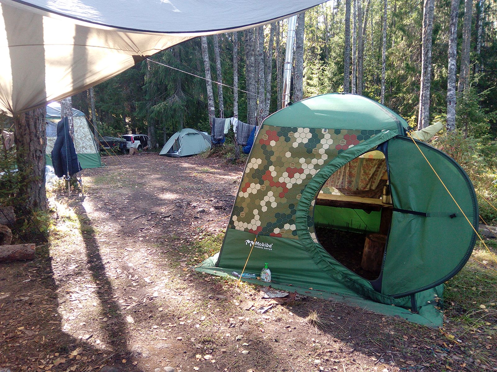 МБ-15 в связке с Согрой отлично справилась со своей ролью. Готовили как на печи, так и на газовой плитке. Каша со свеженамятой брусникой по утрам, тосты на Согре, молотый кофе, сваренный на ней же... После такого завтрака готов к любым свершениям и дальнейшему получения удовольствия. Иногда не хватало вентиляции под потолком, спасались дверью с москиткой или полностью открытой, открыванием верхнего края (или всего) окна, приподниманием юбки поленом. Да, чуть тесновато всемером, но повторюсь, мы худые, да и собирались за столом все вместе не каждый прием пищи. Через петли для клевант внутреннего тента натянули веревки, и использовали их как сушилку для вещей. На ночь набил полную топку, и все постиранное с утра было сухое.