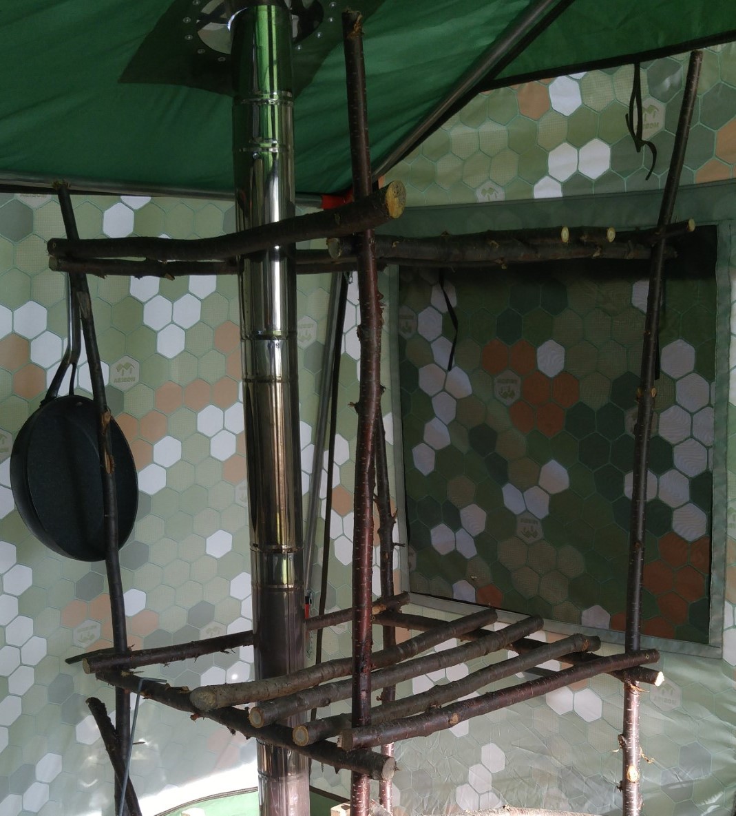 Единственной проблемой стало то, что левая раскладушка перекрыла доступ в МБ-22. До меня только потом дошло, что надо было переставить МБ-22 наоборот, торцом в шлюз. Тогда это была бы полноценная палатка с отдельным входом. А КЦ-3 могла бы помочь обогреть, если что. И труба бы оказалась в стороне от ВП-33, еще больше снижая вероятность прожогов. А так она у самой стены.