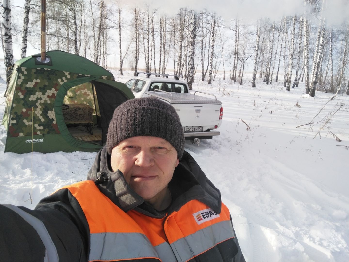 Необратимый процесс погружения в пучину мобиба удовольствий продолжается, имею что показать. В выходные отважился совершить следующий поступок, по мнению супруги "совсем мужчинка головой тронулся", впервые попарился на природе в морозец. Ну ладно, задумано - сделано, на улице -13 с небольшим ветерком, быстрые сборы, сочувствующий взгляд дорогой и вот она березовая рощица. Внутренним тентом еще пока не обзавелся, на пол уложен ПУ 15, хватит его беречь, накидку ИЗН не стал использовать, палатку по периметру присыпал снегом и вот оно блаженство, паробомба - чудопечь свое дело знает, под потолком 90-100 гр., на полке 70-80 гр. А какое это непередаваемое ощущение упасть мордой в снег, ух....